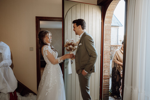 Tijdens de receptie maakten we van het zonnetje gebruik en trokken we naar Ter Dolen voor hun trouwfoto's. We begonnen met wat foto's bij de oldtimer, waar het inbegrepen flesje cava werd gepopt. Daarna trokken we naar het kasteel, waarvoor we een kleine vergoeding moesten betalen, maar dat was het zeker en vast waard.