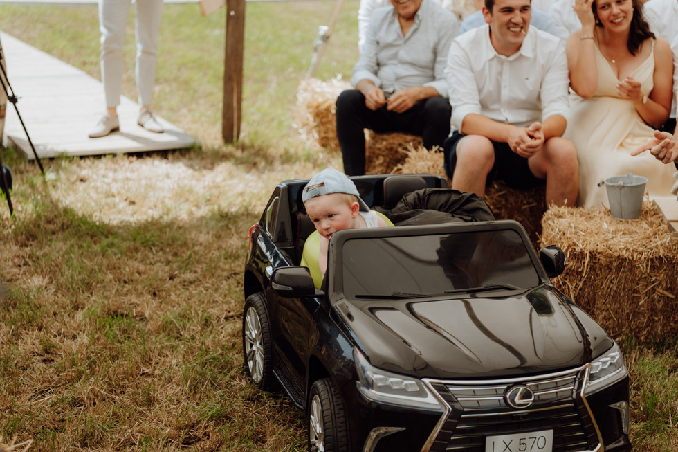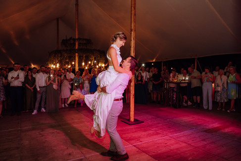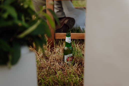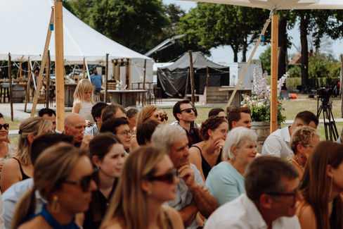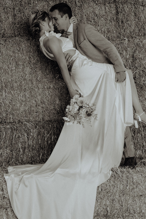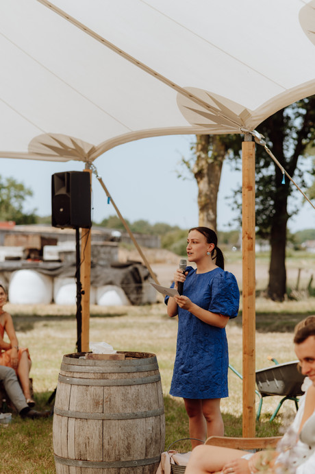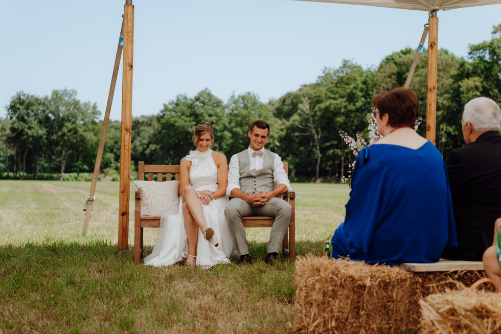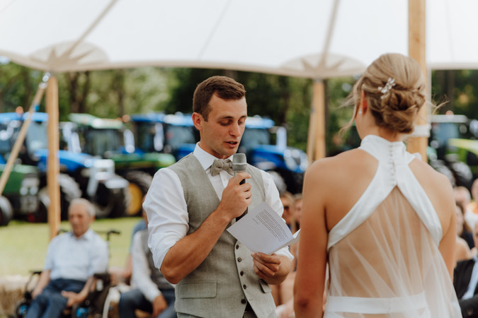 De rest van de dag speelde zich af bij een tent op de boerderij. Lunch, trouwfotoās tussen de koeien en het aardappelveld, een ceremonie vol emotie, een receptie met groepsfotoās in de wei, een BBQ waarbij het water je uit de mond liep⦠Het was ƩƩn groot feest dat voelde als thuiskomen.
