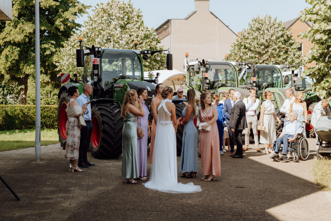 Daarna: de tractorstoet. Jep, een hele stoet vol tractors die achter hen naar het gemeentehuis reden. Na de burgerlijke trouw, reed diezelfde stoet hen weer terug naar de wei waar alles verder doorging. Geweldig om te zien, en ook echt 100% hen.
